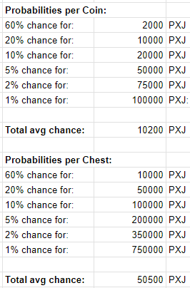 When unpacked each of the two types will unpack into a random amount of PXJ. For the coins it ranges from 2000 PXJ to 100k PXJ, and for chests it ranges from 10k PXJ to 750k PXJ.&#x20;