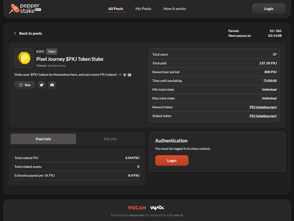 In the "Pool Info" table further below you can check up on how much PXJ is staked in total in the pool. This is a very important metric, as the more tokens are locked the lower the rewards per tokens locked. There's no direct "APR stat" on Pepper Stake at this moment, however you can calculate it from the total tokens staked in the following manner:
