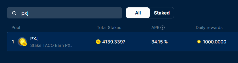 <figure><img src="https://4287151513-files.gitbook.io/~/files/v0/b/gitbook-x-prod.appspot.com/o/spaces%2FfO47XZHzVvuoTD5TVJoJ%2Fuploads%2F4l8wNuPYpiC5mM3sz7Kd%2Fimage.png?alt=media&#x26;token=418c75ed-62db-4d0e-9b81-4b74cf86a54f" alt=""><figcaption><p>SALSA Pool on Tacoswap -> Stake TACO Earn PXJ</p></figcaption></figure>